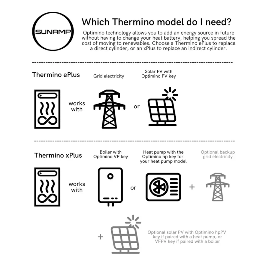 It can integrate with various energy sources, including solar panels (PV), air source heat pumps, ground source heat pumps, and electric boilers. The latest models are future-proofed, allowing you to add renewable sources later without changing the main unit.