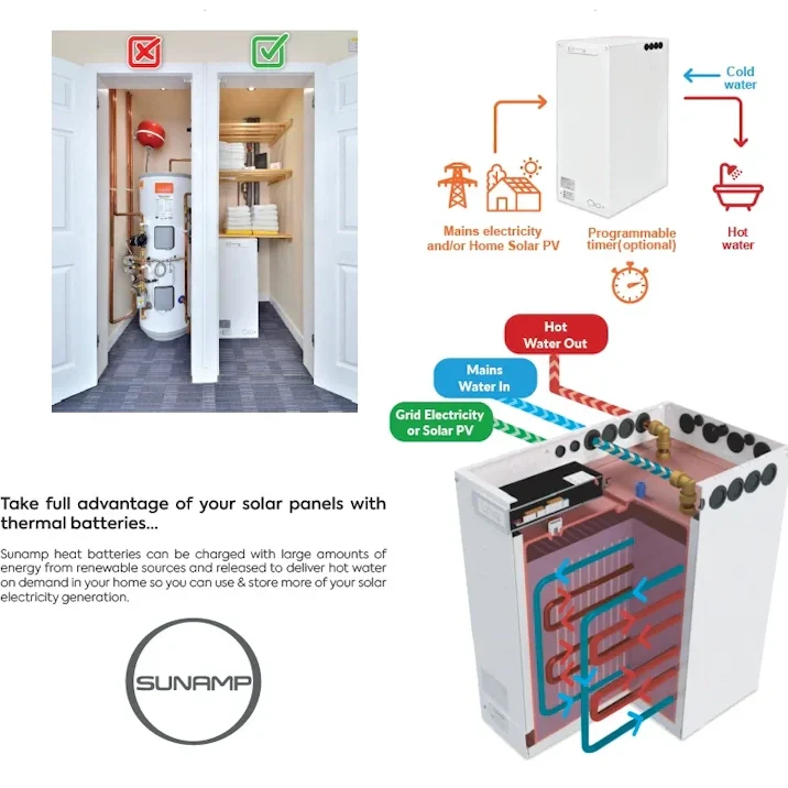 The Sunamp thermal battery is a compact, highly efficient energy storage system that provides instant, mains-pressure hot water on demand using a special non-toxic phase change material (PCM) instead of a large water tank. It is designed to work with renewable energy sources and standard grid electricity to save space, reduce energy bills, and lower carbon emissions.